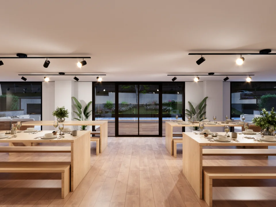 El edificio gozará de un local comunitario junto a la zona ajardinada y piscina para posible uso de txoko comunitario o local gastronómico.
